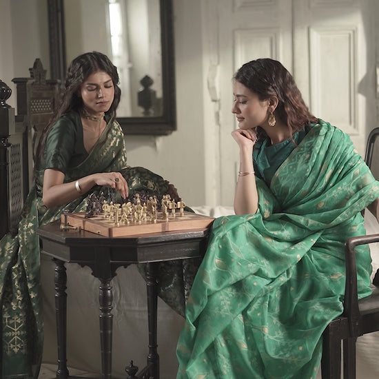 In deep, dark green, this saree reveals the magnificence of traditional Jamdani at its most intricate. The body is richly adorned with an all-over spread of fine motifs, each painstakingly woven into the fabric without sketch or stencil — only the weaver’s skill and memory guiding the threads. The border frames this artistry with a gorgeous expanse of detailed weaving, adding weight and grandeur to the drape. Rare and resplendent, this is not merely a saree but a work of heritage — a weave to be treasured as an heirloom, embodying centuries of Jamdani mastery.