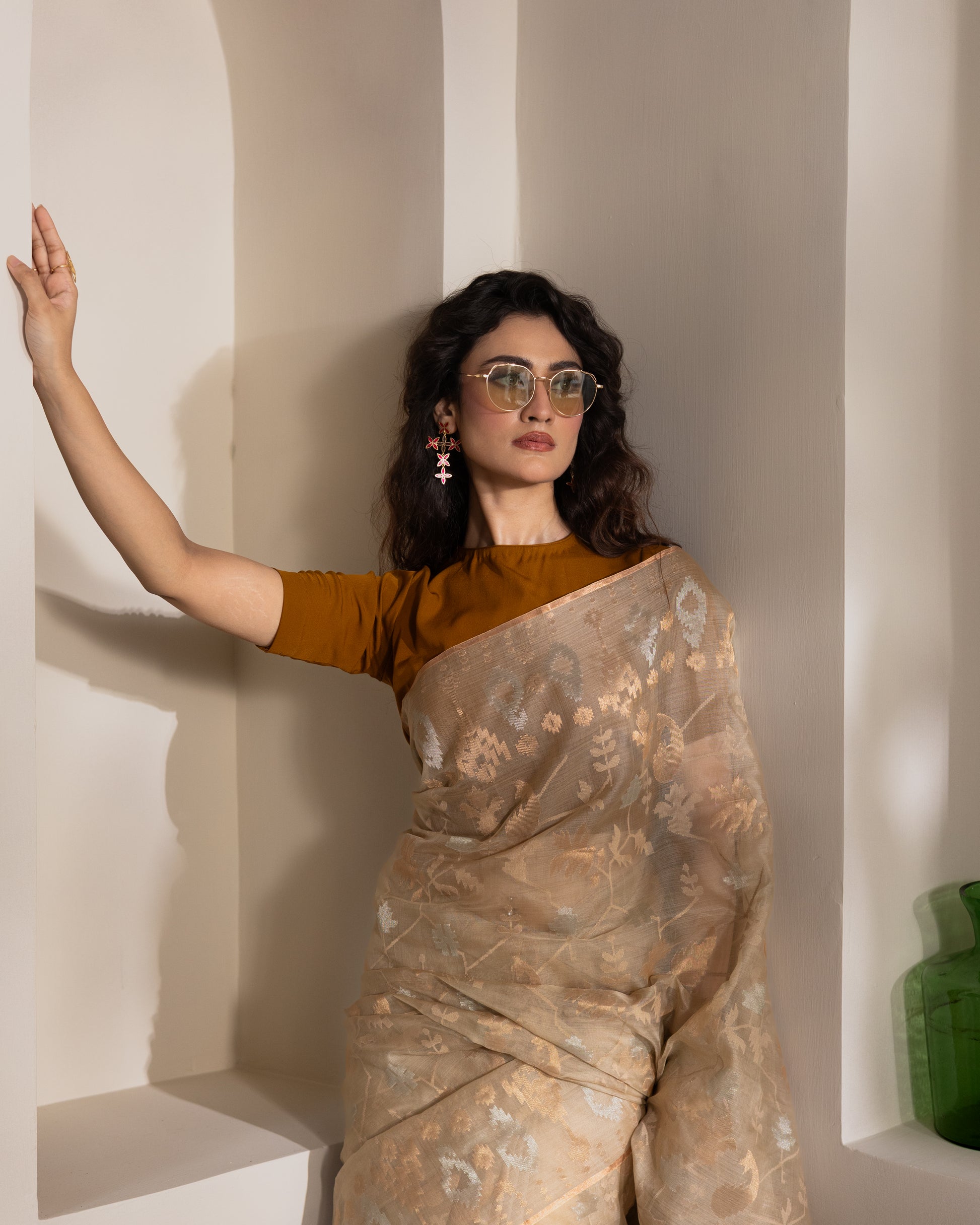 In a soft shade of beige, the saree is adorned with self-thread embroidery in gold and silver, lending it a gentle, luminous sheen. A fine golden zari selvedge frames the drape with quiet opulence, while the handwoven texture adds depth and character. Timeless, refined, and effortlessly elegant — a piece that reflects the artistry of our weavers and the discerning taste of those who wear it.