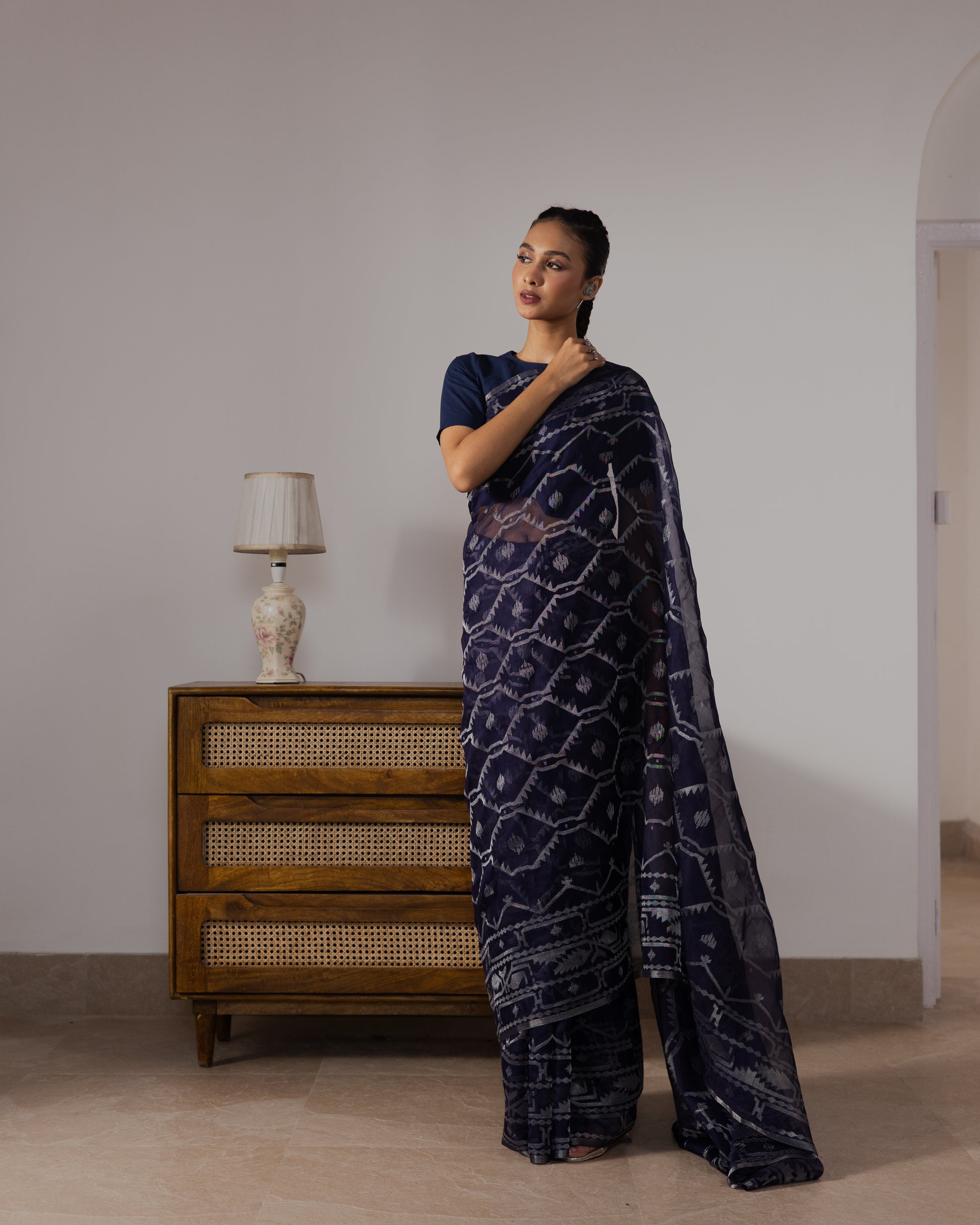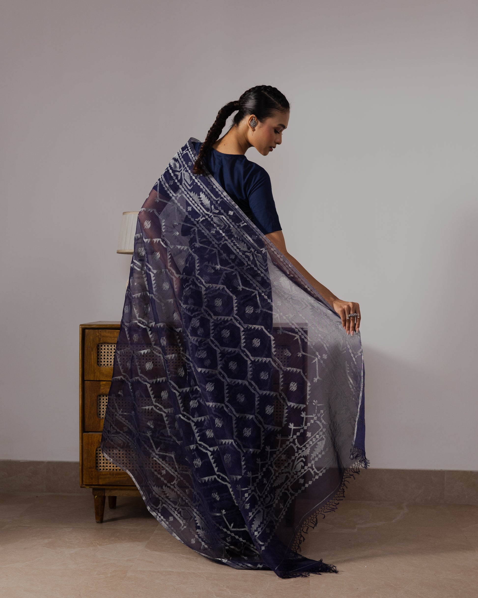 In a deep, rich shade of blue, this silk Jamdani saree is a stunning expression of traditional artistry. The body features the intricate "Korat Jaal" pattern, while silver zari threads glimmer softly across the weave, creating a play of light and texture that feels both regal and understated. Framed by a beautifully detailed border, it exudes timeless allure — a masterpiece that captures the essence of Bengal’s weaving heritage with quiet sophistication.