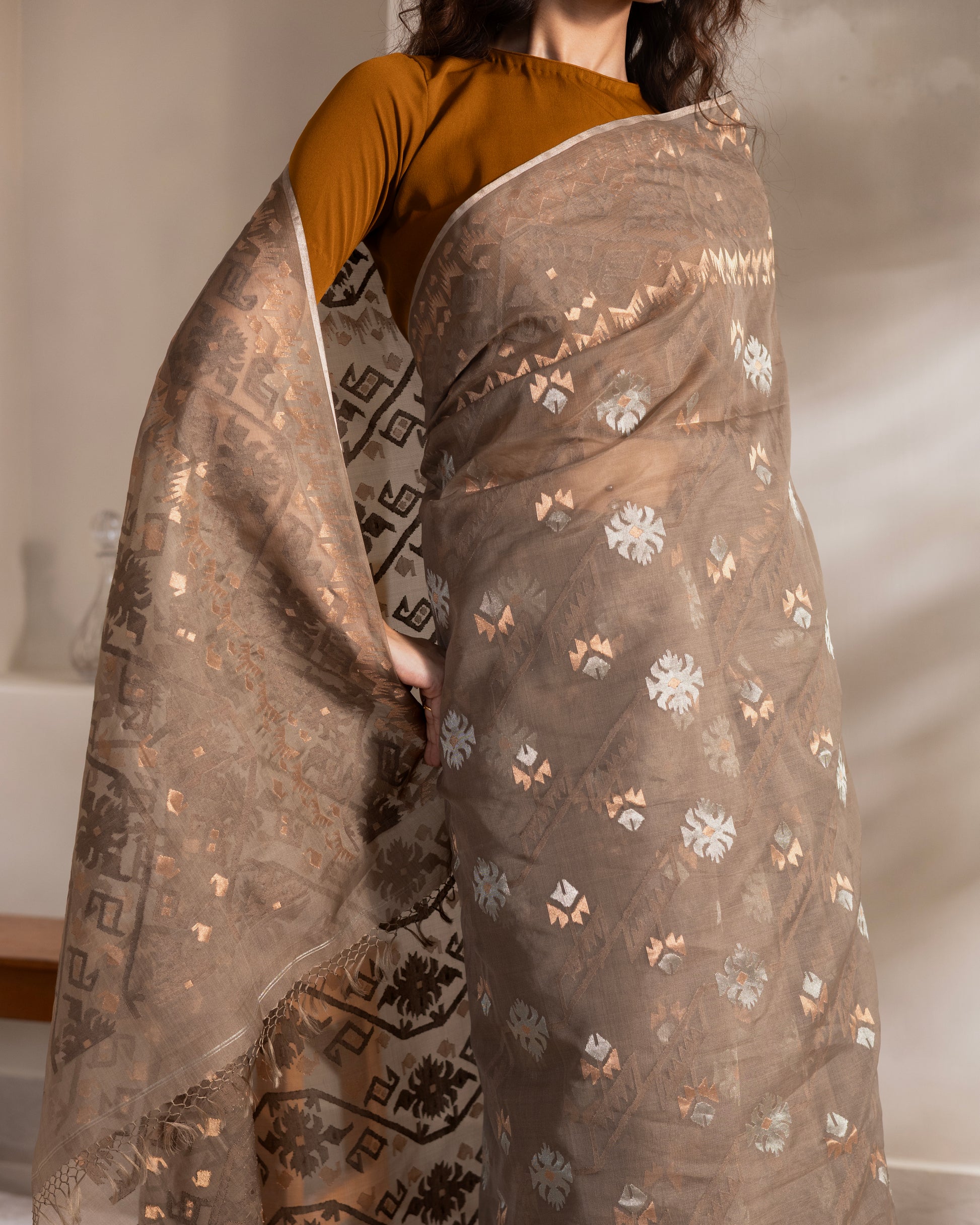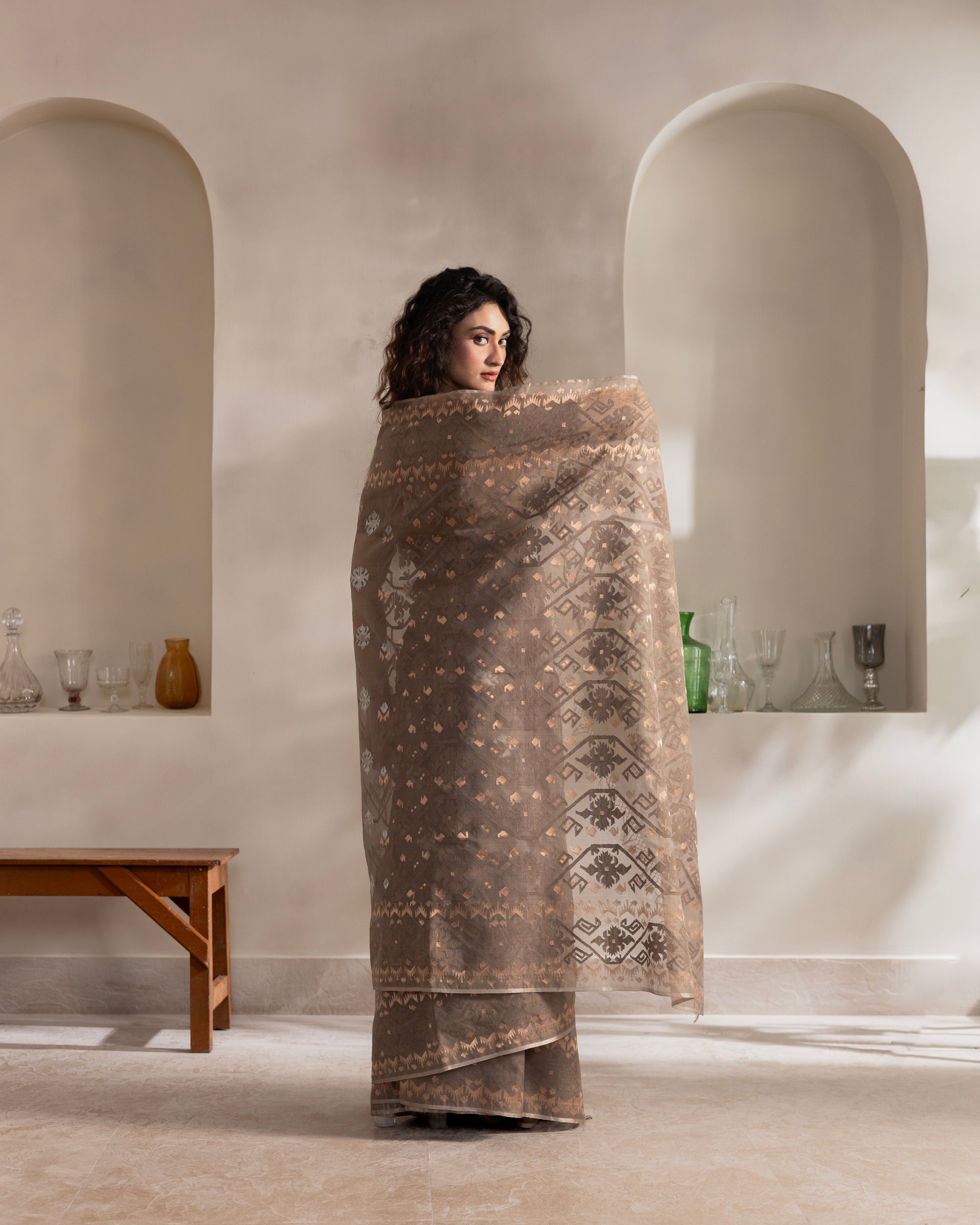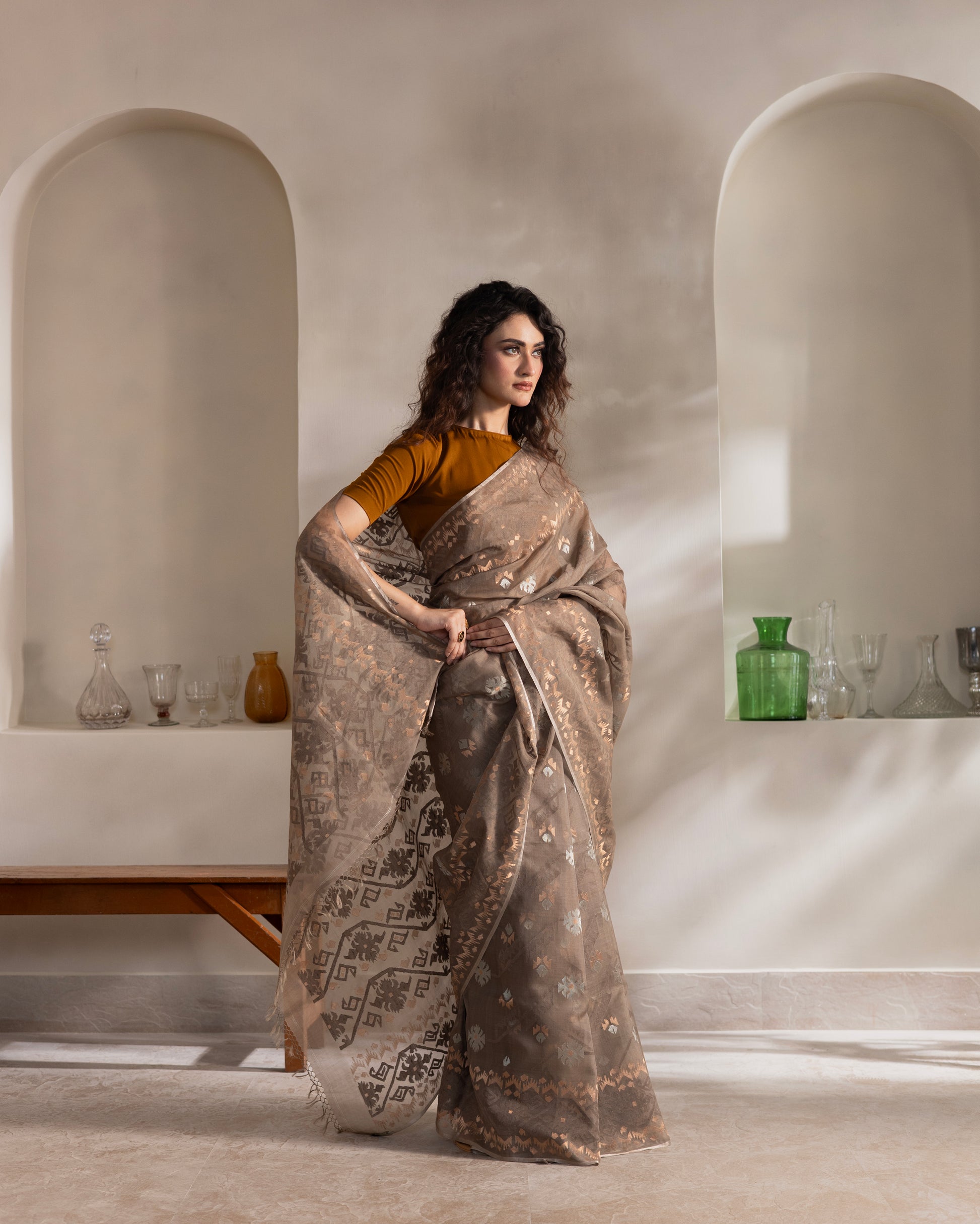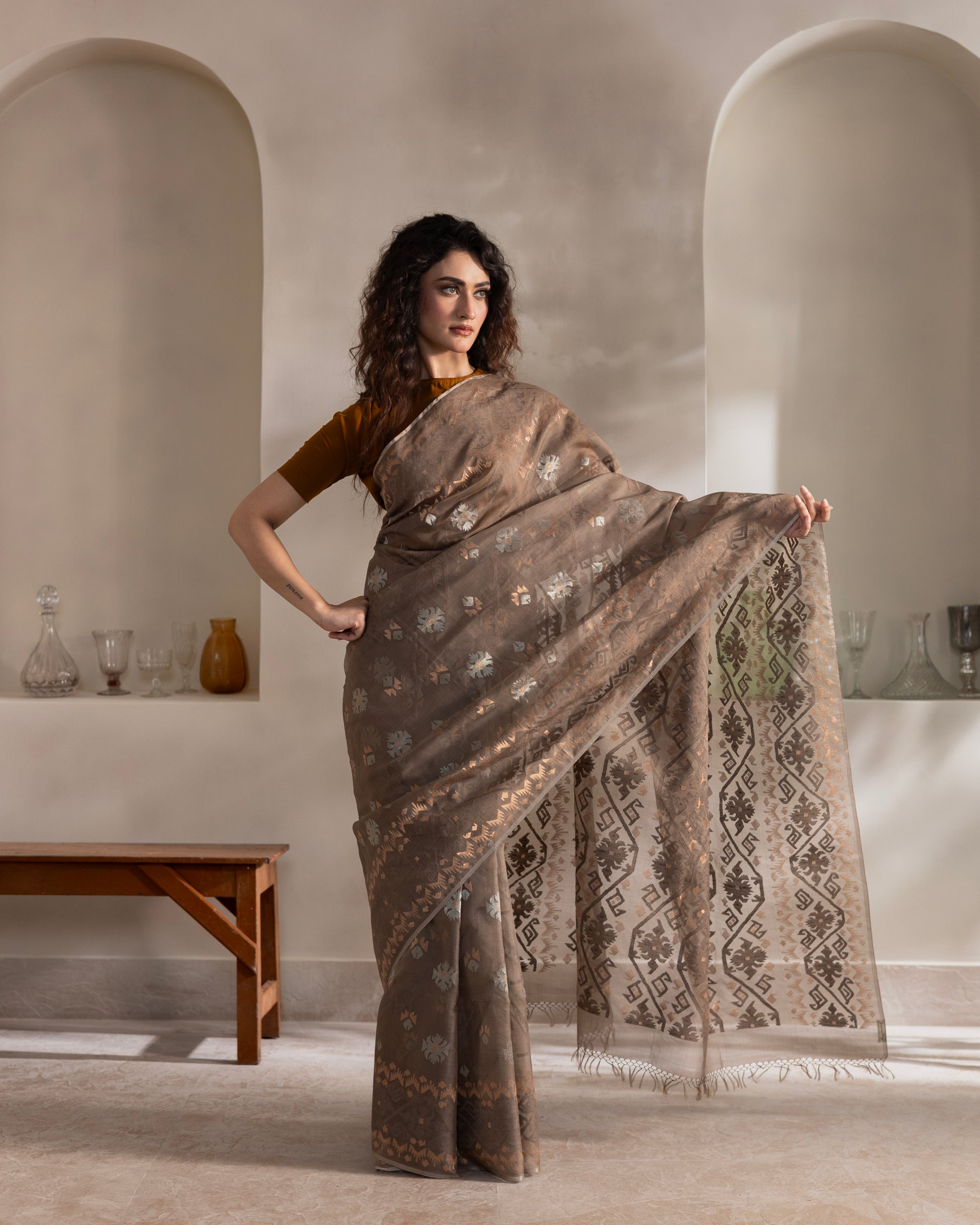 Stone Grey Pure Organza Traditional Jamdani Saree