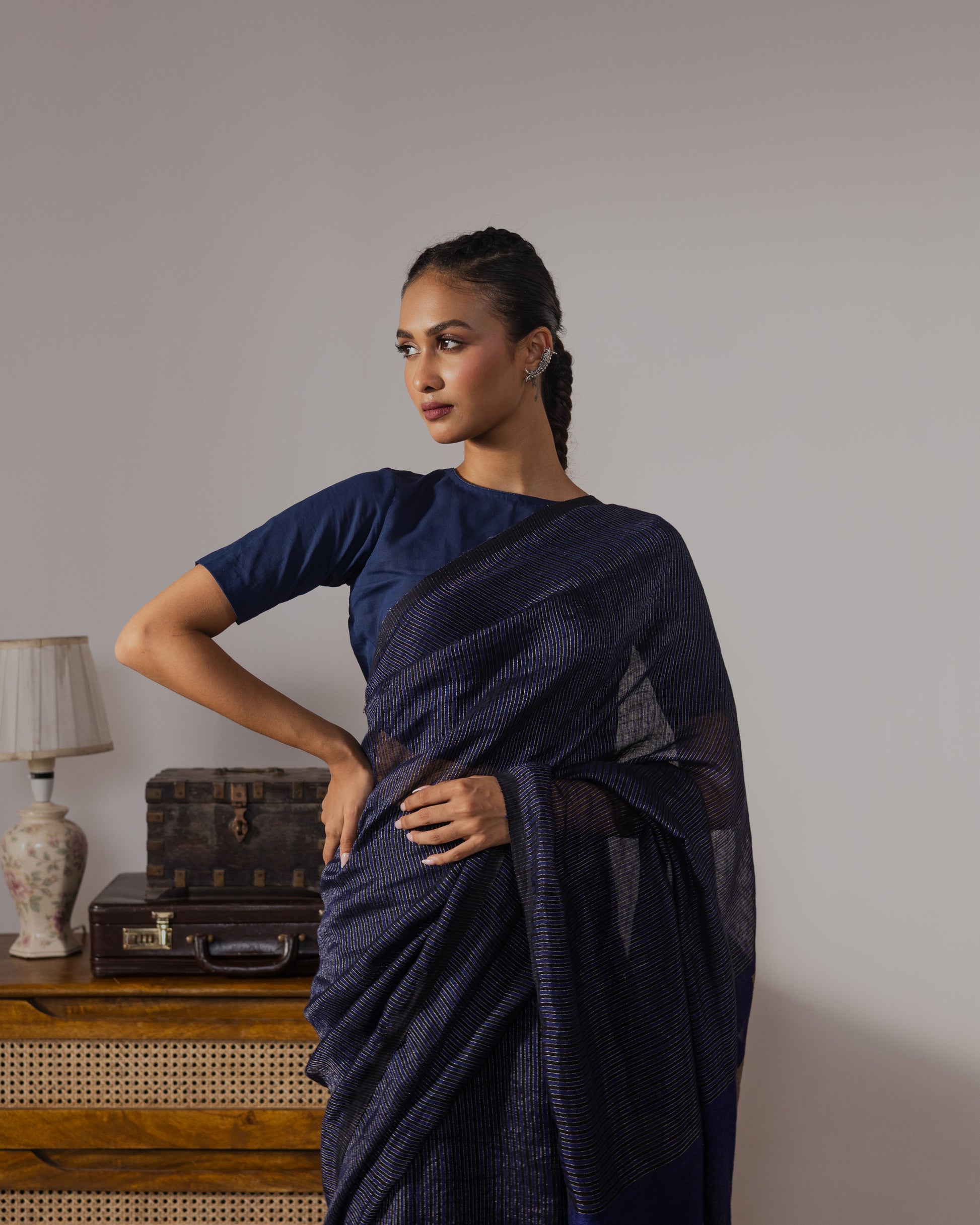 Elegant, modern, and beautifully handwoven — this pure 80 lea linen Jamdani saree in deep dark blue is a perfect balance of subtle shimmer and artistic detail. The body features thin silver zari stripes running seamlessly all the way into the pallu, giving the saree a soft, continuous sheen that enhances its rich colour.