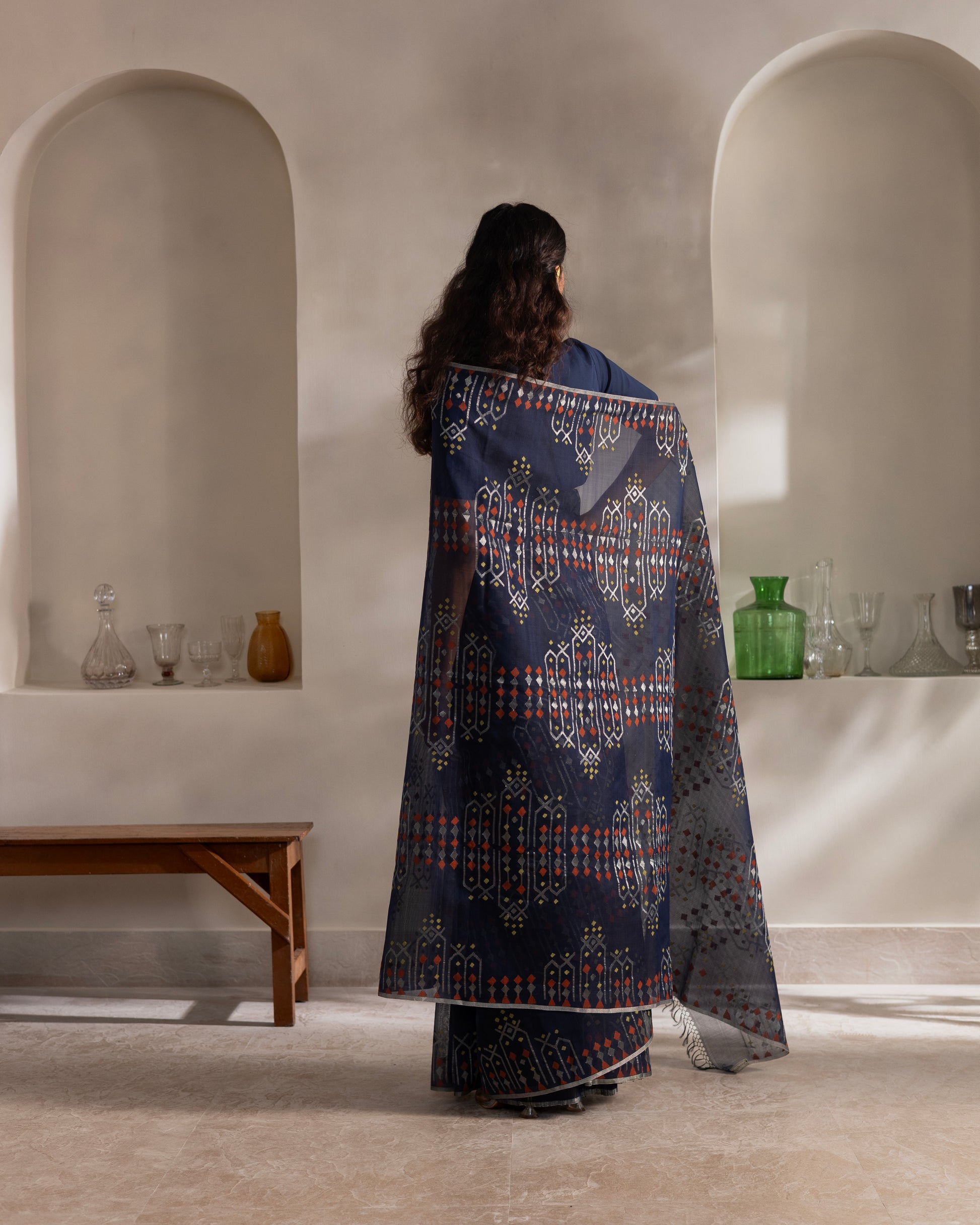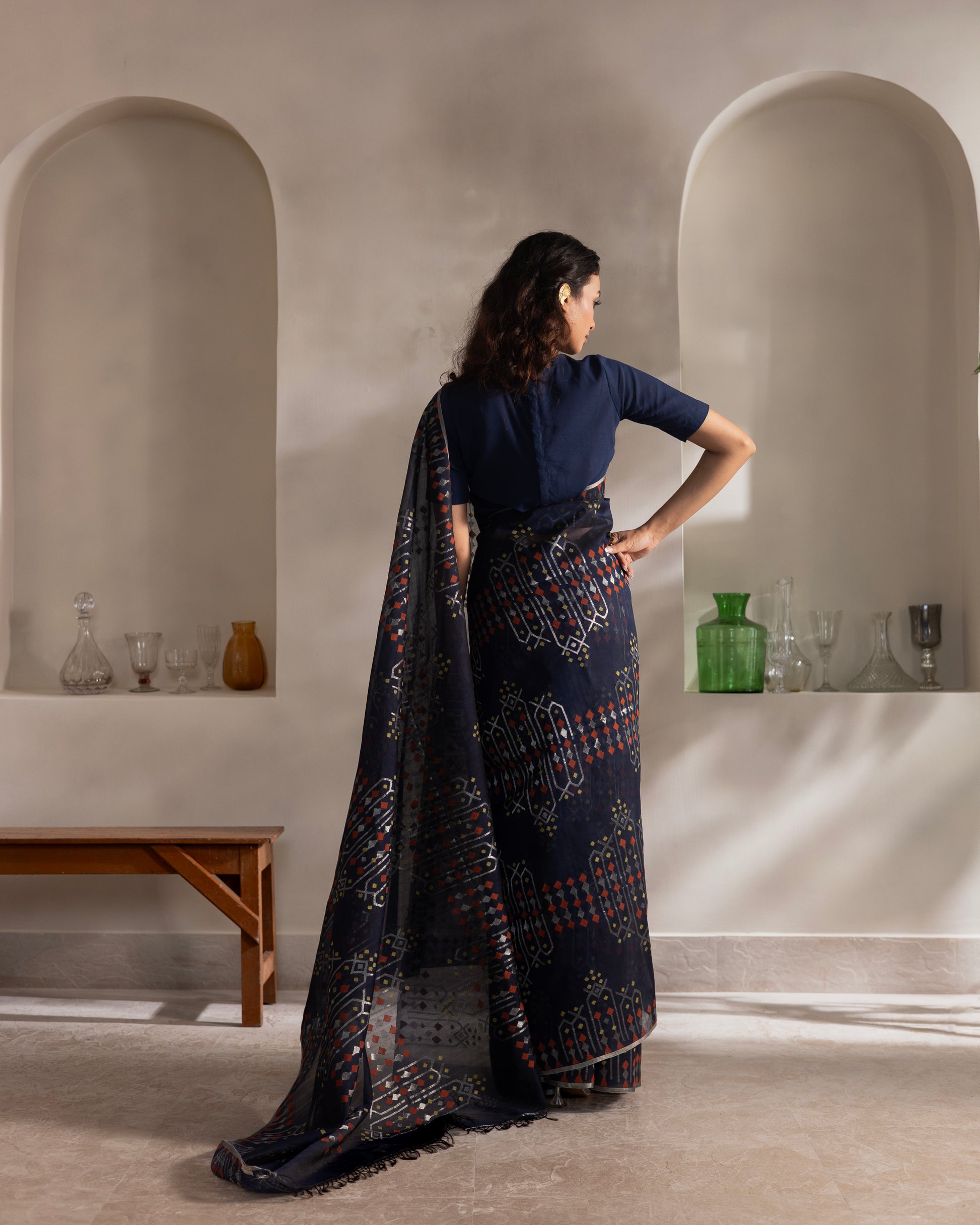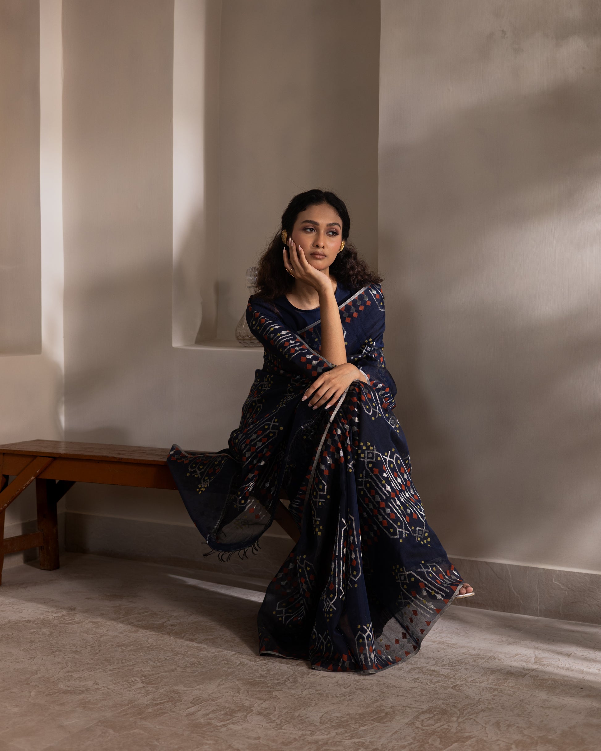 Woven in pure organza silk, this saree comes alive in a rich midnight blue body, enhanced with Jamdani motifs in orange, fluorescent green, and silver zari. The design carries a geometric checkered layout interspersed with cross-inspired patterns, creating a contemporary rhythm within the handloom weave. Sheer, lightweight, and luminous, the drape blends elegance with modernity — a refined Jamdani perfect for evenings and special occasions.