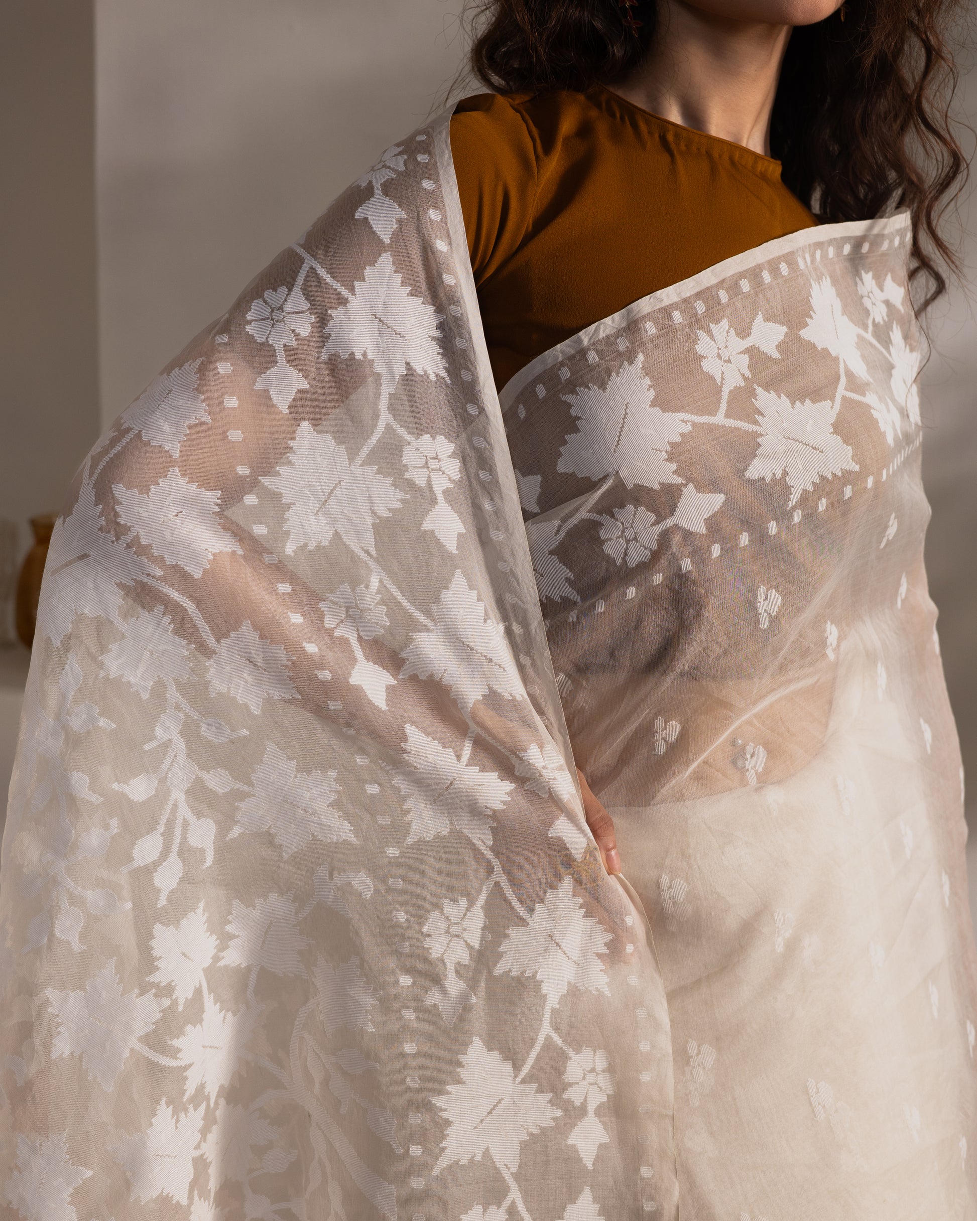 Woven in West Bengal, this Jamdani saree is a quiet masterpiece inspired by the grandeur of Kashmir’s Jamavar. Along the borders and pallu, chinar leaf vines unfold in graceful rhythm, each leaf and vein handwoven, where pattern and fabric are created together on the loom.